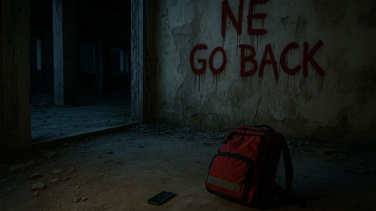 W środku panowała duszna, nieprzyjemna cisza. Ściany pomieszczenia były surowe, betonowe, bez okien. Na środku stały trzy plastikowe krzesła, jedno wywrócone. W kącie leżała rozbita latarka. Obok – długi, krwawy ślad, jakby ktoś czołgał się po podłodze.